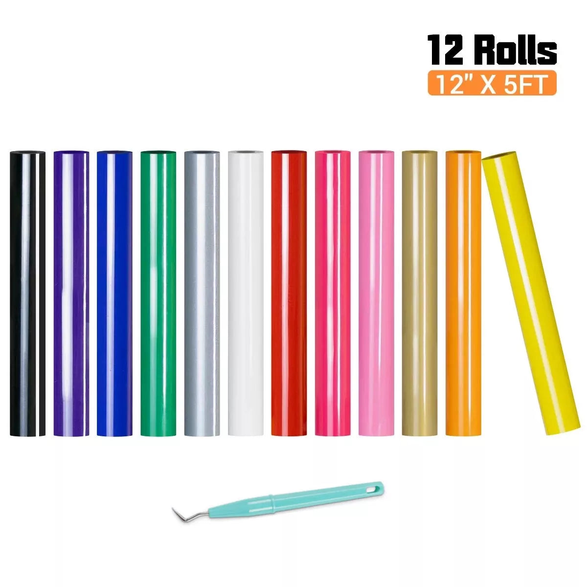 🌈 VIBRANT COLORS 🌈: HTVRONT Heat transfer vinyl rolls have 12 and 6 popular colors: red, green, yellow, orange, black and white. All 12 and 6 colors are in the size of 12 inches by 5 feet. There is no more difficulty in choosing colors. You can get six various colors of small size HTV rolls at the same time. Different colors of HTV bundle can be combined to enrich your design, making up colorful and vivid patterns.